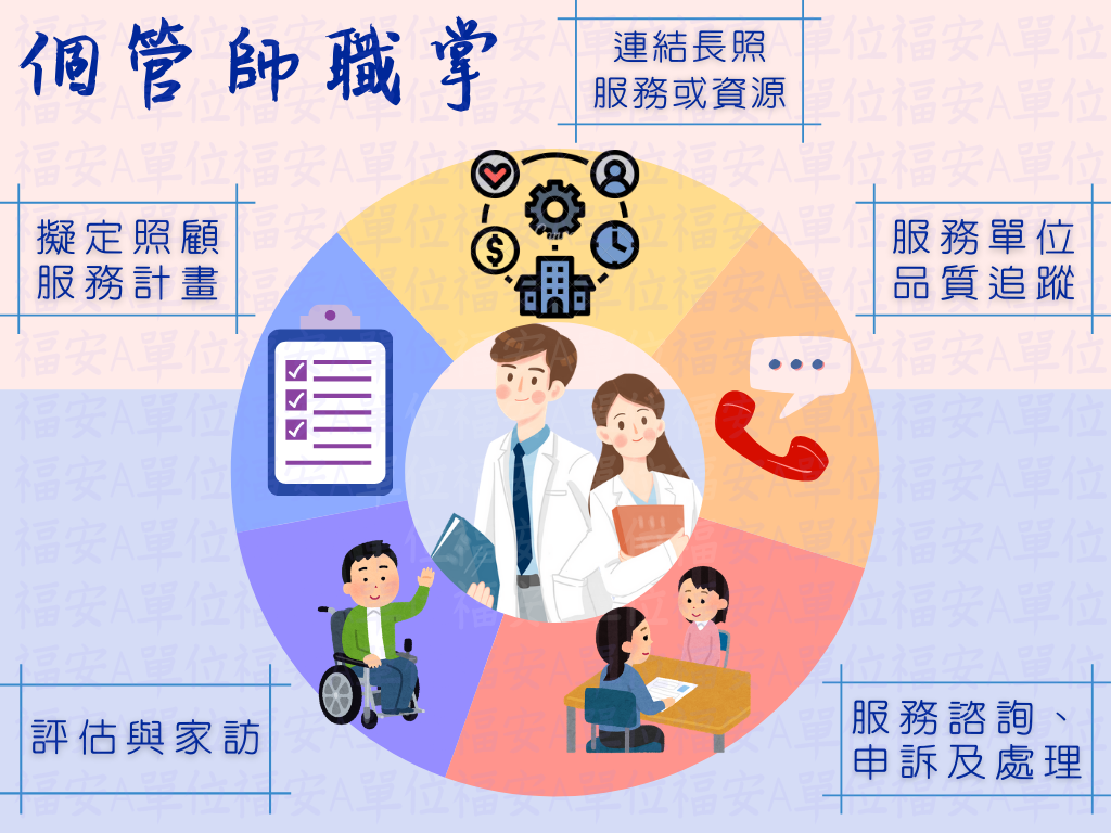 專責提供長照服務,如:照顧及專業服務、日間照顧、家庭托顧、交通接送、餐飲服務、輔具服務、喘息服務等。