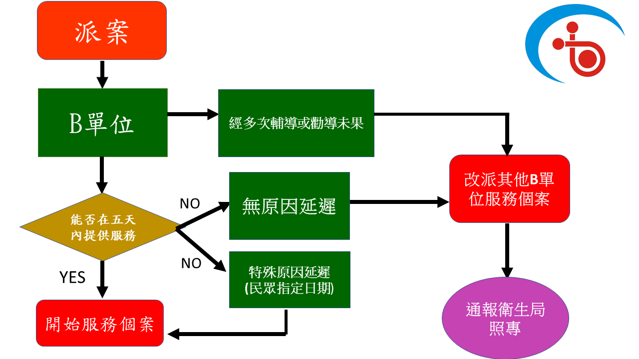 (七)接受照會B單位原則不得無故拒絕接案,倘有正當事由未能提供服務,依A單位改派原則另行安排,以維護服務使用者權益。