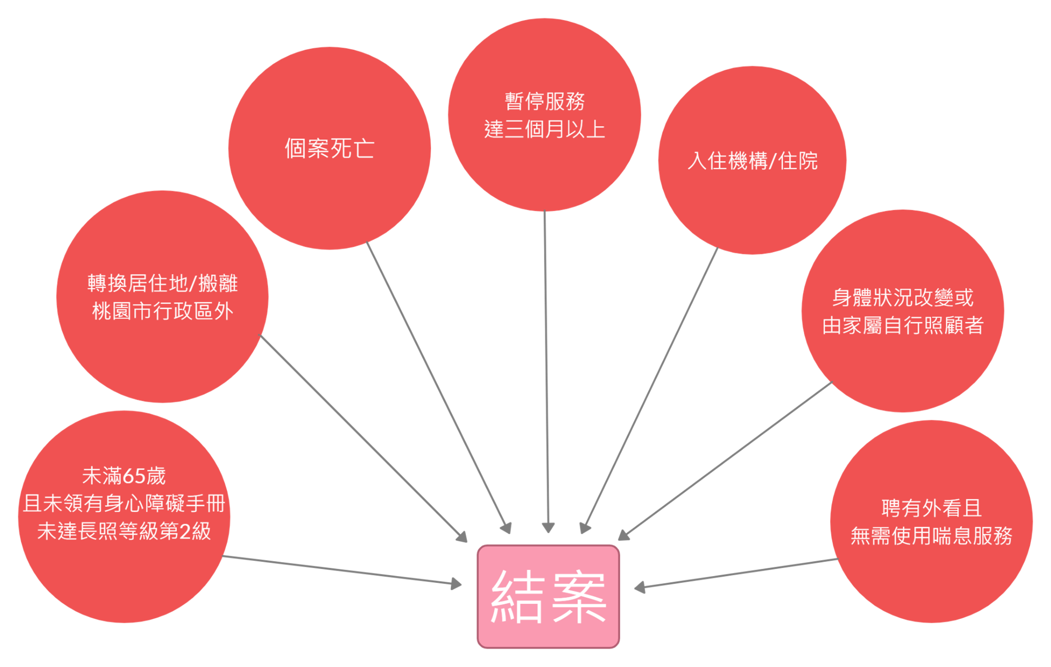 目的:服務對象若有下列情形應予結案,A單位個管則向桃園市長期照顧中心專員進入結案流程